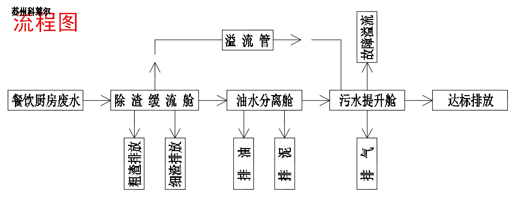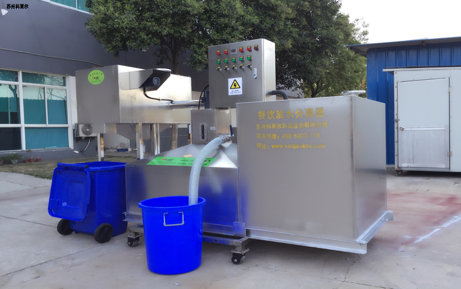 隔油器主要由進水口、除渣機、雜物分離倉、細微顆粒存儲區、排渣閥、油水分離區、儲油區、恒溫電加熱系統、攪拌系統、油窗視鏡、排油口、排空閥、液位控制系統、污水提升裝置等。工作原理為:含油廢水進入隔油器后,通過特殊設計的鋸齒堰結構,將雜物攔截至儲渣區定期打開閥門排出雜物。含油廢水通過第一倉溢流(降低水的流速)進第二倉油水分離倉,油水分離倉為全密閉非對稱結構,廢水在油水分離區停留大于4分鐘以上,油脂將自動收集至廢油存儲,用戶可通過設置在費油區域的油窗視鏡觀察廢油倉的油位情況,如油位較高可手動打開排油閥門將廢油排至設備外部廢有桶內;設備廢油倉設有自動恒溫裝置,防止溫度較低油脂結塊,以提高排油效率;設備廢油倉還設有攪拌裝置防止用戶長時間不排油,油脂板結無法排出。設備帶有自動提升功能,當設備內廢水水位到達設備的最低液位時,單臺泵啟動排水,到達高點時兩臺泵同時啟動排水,到達最頂點時設備發出報警以提醒用戶,污水超出設備設計處理能力2倍以上。
